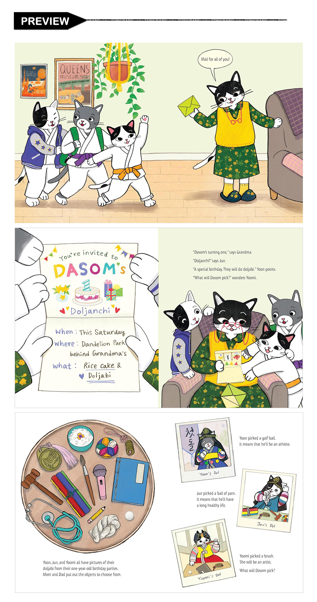 The whole family is gathering to celebrate baby cousin's 1st birthday. They will do the doljabi! Dasom's mommy will assemble a microphone, a ball, money, yarn, a paintbrush, and other things. Dasom will pick something, and that will decide her future. If she picks a ball, she will be an athlete. If she picks a paintbrush, she will be an artist.