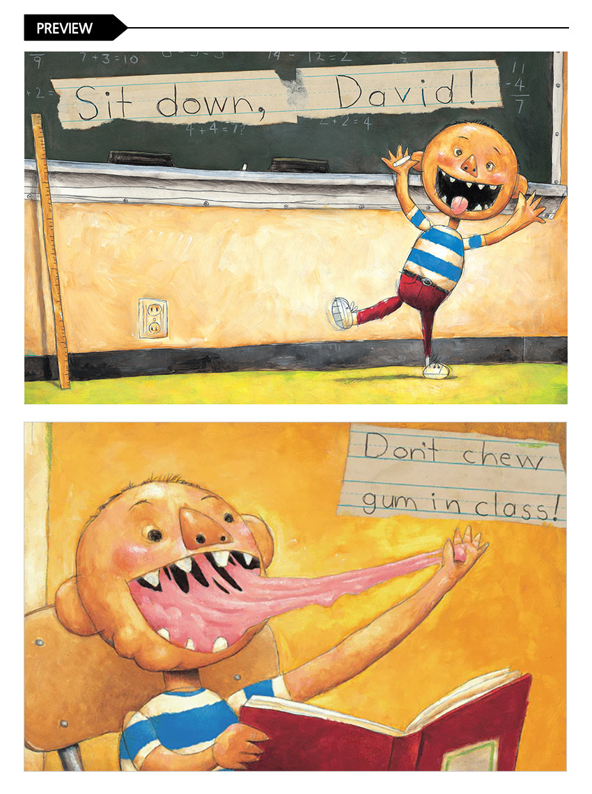 David's teacher has her hands full. From running in the halls to chewing gum in class, David's high-energy antics fill each school day with trouble, and are sure to bring a smile to even the best-behaved reader.