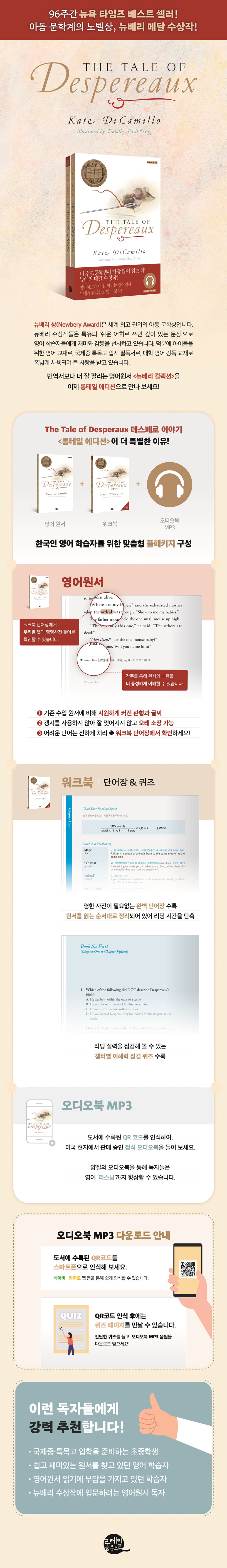 ¡¸´ºº£¸® Ä÷º¼Ç¡¹ ¡ºµ¥½ºÆä·Î À̾߱â(The Tale of Despereaux)¡»Àº 2004³â ´ºº£¸® ¸Þ´ÞÀ» ¼ö»óÇÑ, ¹Ì±¹ÀÇ ¾Æµ¿¹®ÇÐ ÀÛ°¡ ÄÉÀÌÆ® µðÄ«¹Ð·ÎÀÇ ´ëÇ¥ÀÛÀÔ´Ï´Ù. Àý´ë ¿µ¿õó·³ º¸ÀÌÁö ¾Ê´Â ¿µ¿õ, »ýÁã µ¥½ºÆä·Î(Despereaux)ÀÇ À̾߱⸦ ´ã°í ÀÖ´Â ÀÌ ÀÛǰÀº 2008³â ¾Ö´Ï¸ÞÀ̼ÇÀ¸·Îµµ ¸¸µé¾îÁ® ¸¹Àº »ç¶÷µé¿¡°Ô »ç¶û ¹Þ¾Ò½À´Ï´Ù.´õ¿íÀÌ ¡¸´ºº£¸® Ä÷º¼Ç¡¹½Ã¸®Áî·Î Ãâ°£µÈ À̹ø Ã¥¿¡´Â ¡®¿µ¾î ¿ø¼¡¯¿Í ¡®¿öÅ©ºÏ¡¯ÀÇ ±âº» ±¸¼º¿¡ ¹Ì±¹ ÇöÁö¿¡¼ 20´Þ·¯¿¡ ÆÇ¸ÅµÇ°í ÀÖ´Â Á¤½Ä ¡®¿Àµð¿ÀºÏ¡¯ÀÌ ±âº»À¸·Î ÇÔ²² Á¦°øµÇ¾î µ¶Àڵ鿡°Ô ´õ Å« °¨µ¿À» ¼±»çÇØÁÙ °ÍÀÔ´Ï´Ù!