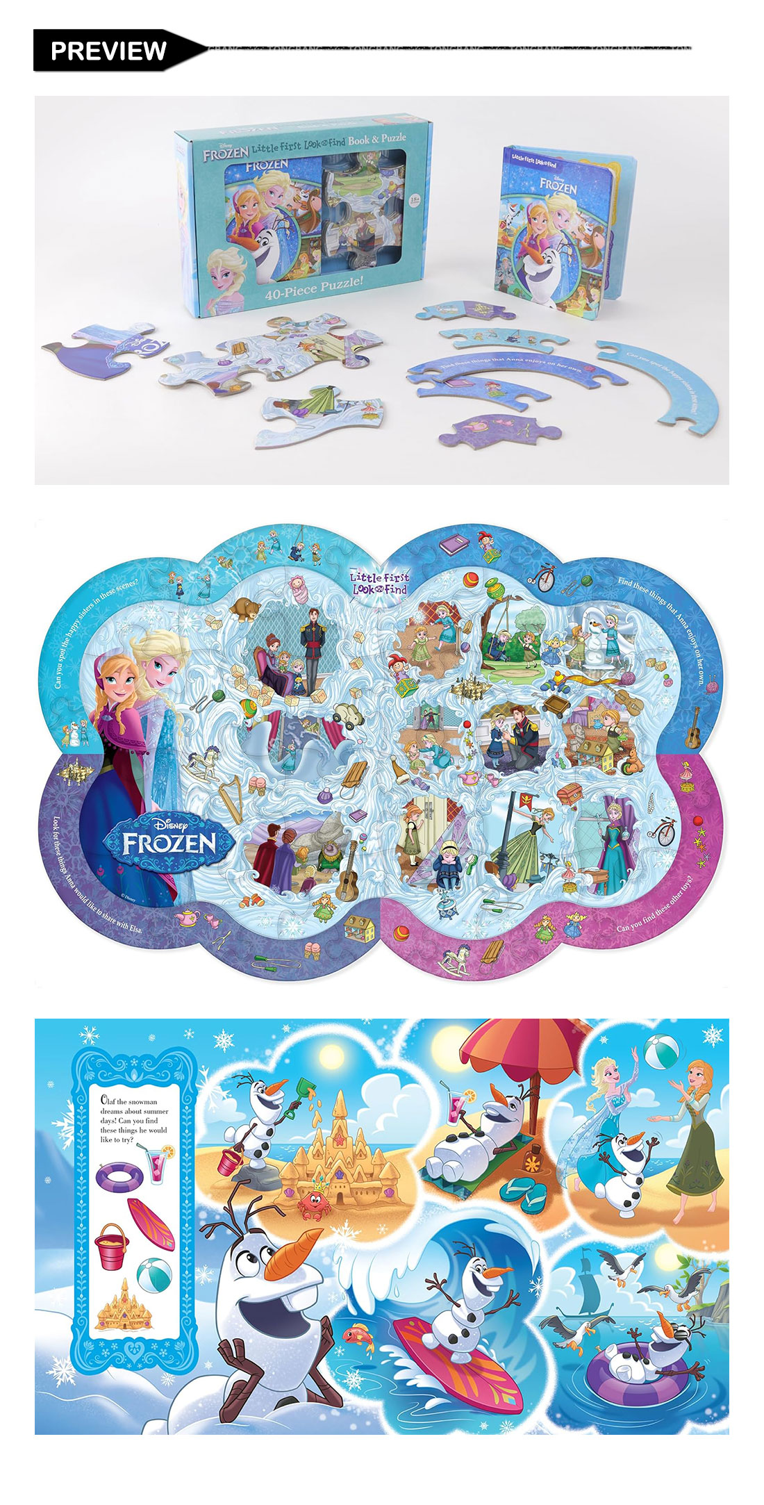 Read the book, then build the puzzle for a bonus Look and Find scene! This box set for preschoolers provides hours of Look and Find fun featuring Elsa, Anna, Olaf, and friends! Includes a Little First Look and Find book and a 40-piece puzzle.