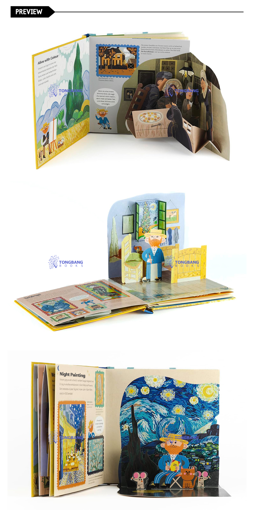The text explains Van Gogh's life and works, including his inspiring pursuit of artistic excellence and his struggles with mental health. The book showcases more than 25 of Van Gogh's most famous works. It also features quotes from Van Gogh's writings in cartoon-style speech bubbles and includes a timeline of the artist's life and a short glossary of art terms for kids.