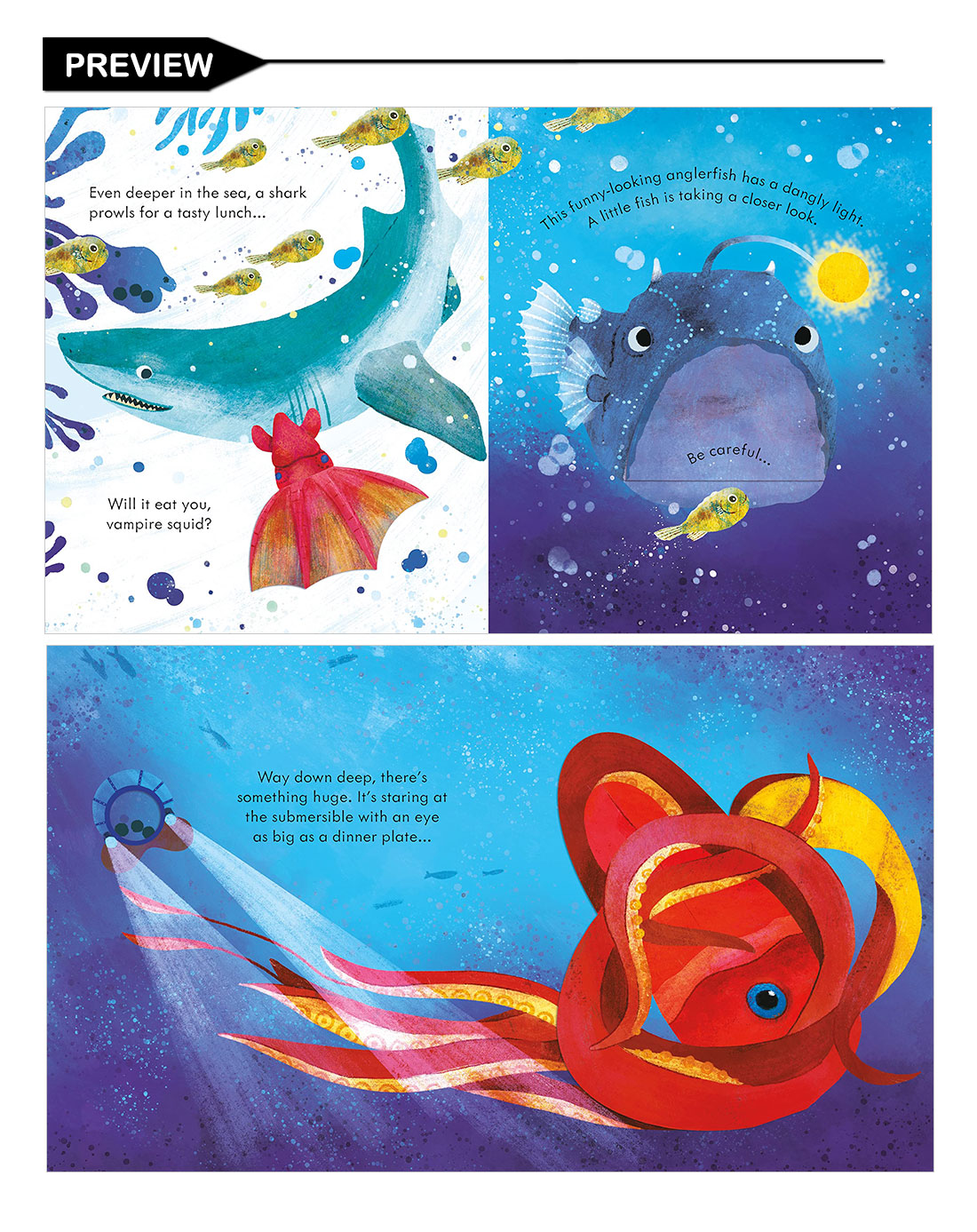 Lift flaps and peep through holes to discover amazing creatures in the deep oceans.<br /> Dive down with a submersible to discover the mysteries of the ocean. Oceans cover most of our planet, and yet most of the depths remain unexplored. This book takes you deep down to find light-up jellyfish, diving whales, giant squid and whole mountains at the bottom of the sea. Flaps and peep holes will draw young children into this intriguing subject, and instill a love of this essential ecosystem.