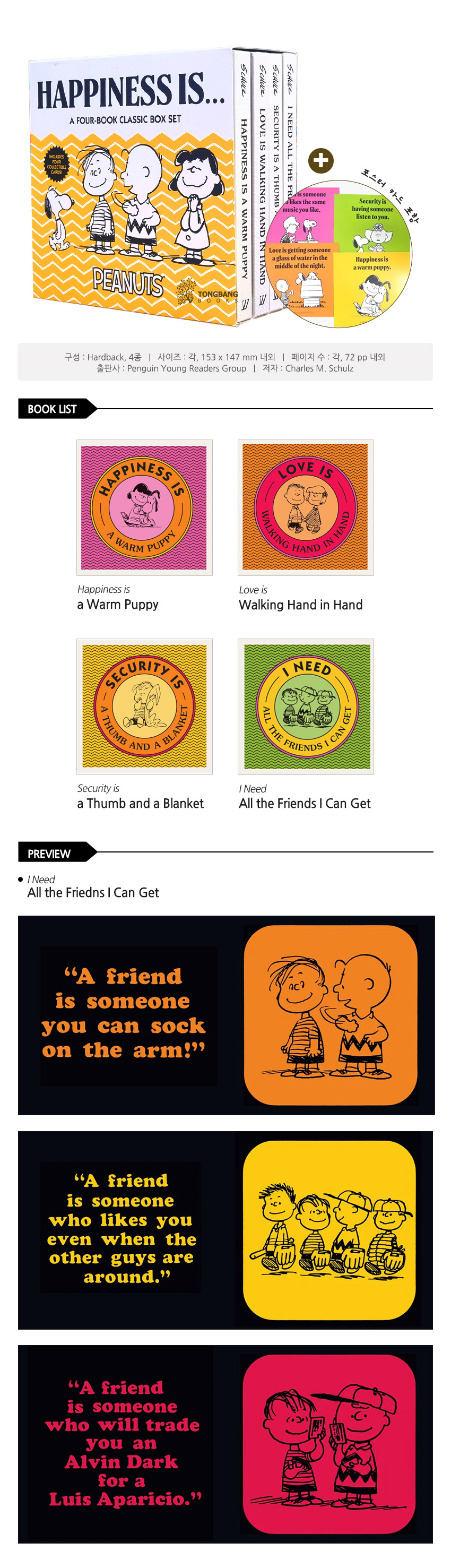 Find the meaning of friendship, love, and comfort in all the little things around us in I Need All the Friends I Can Get, Happiness Is a Warm Puppy, Security Is a Thumb and a Blanket, and Love Is Walking Hand in Hand. The box set also comes with four collectible cards with a Peanuts quote!