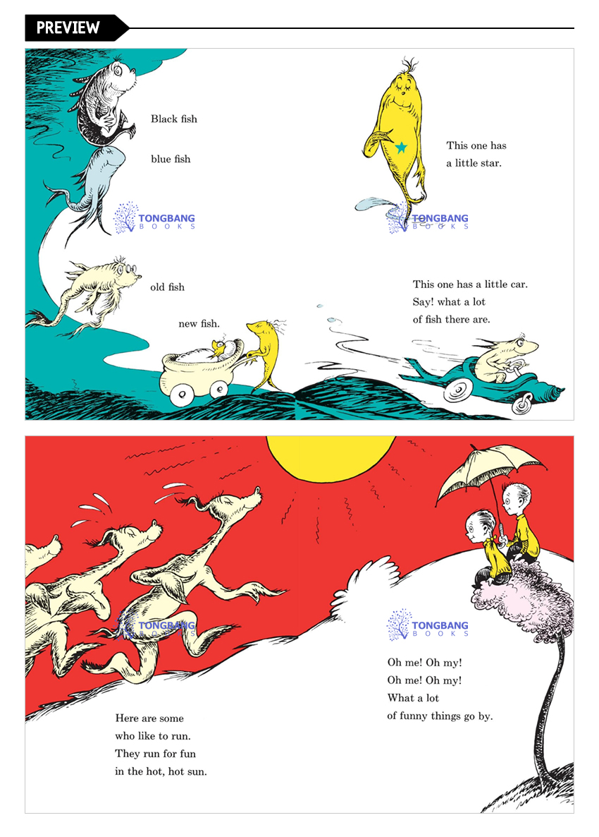 "From there to here, from here to there, funny things are everywhere." Beginning with just five fish and continuing into flights of fancy, One Fish Two Fish Red Fish Blue Fish celebrates how much fun imagination can be. From the can-opening Zans to the boxing Gox to the winking Yink who drinks pink ink, the silly rhymes and colorful cast of characters create an entertaining approach to reading that will have every child giggling from morning to night: "Today is gone. Today was fun. Tomorrow is another one."