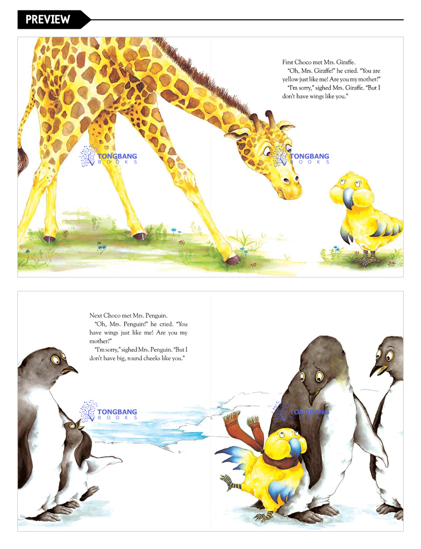 Choco wishes he had a mother, but who could she be? He sets off to find her, asking all kinds of animals, but he doesn't meet anyone who looks just like him. He doesn't even think of asking Mrs. Bear if she's his mother-but then she starts to do just the things a mommy might do. And when she brings him home, he meets her other children-a piglet, a hippo, and an alligator-and learns that families can come in all shapes and sizes and still fit together.