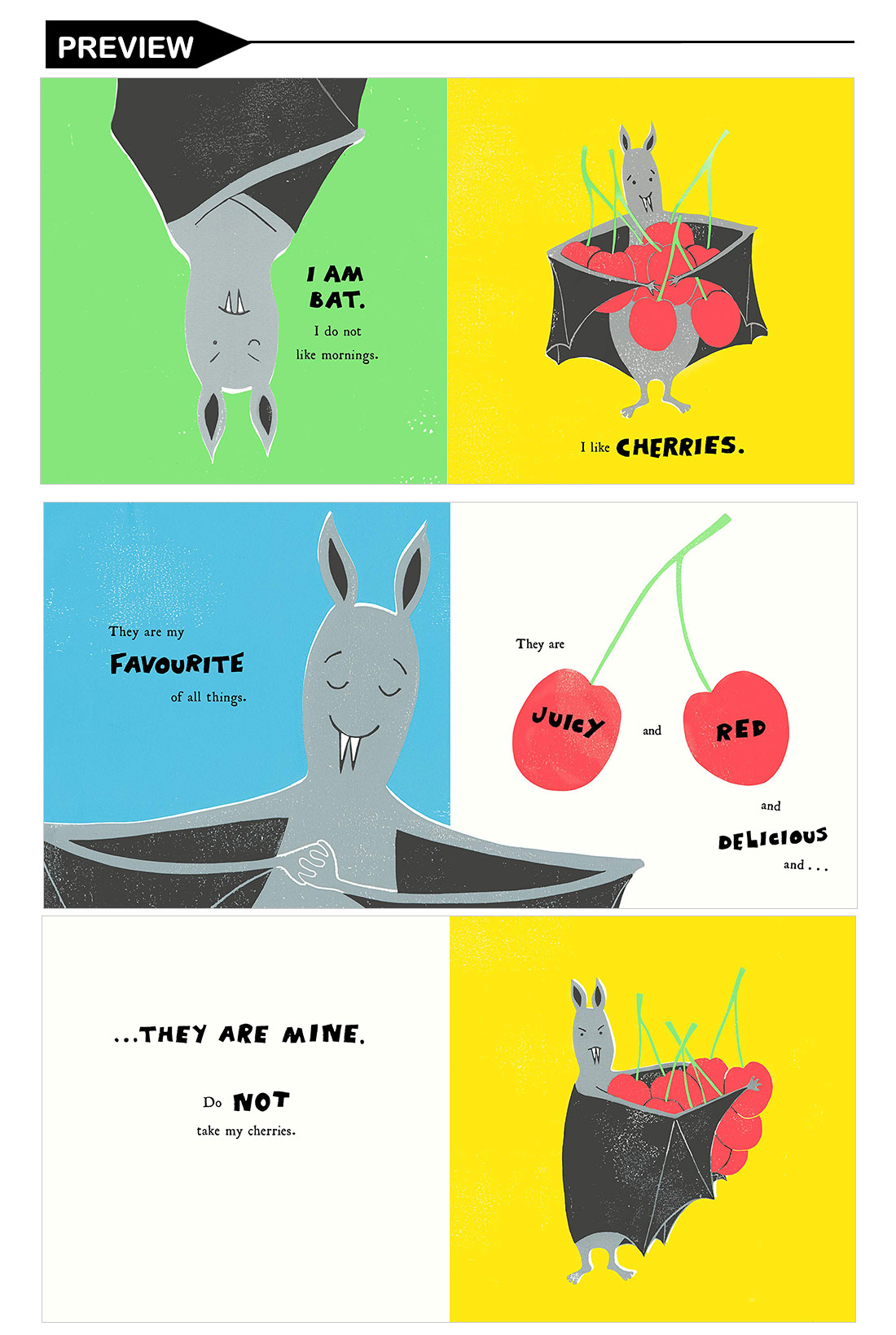 Bat's cherries keep going missing. One by one, they are whisked away by mischievous animal tricksters behind Bat's back. Super-talent Morag Hood cleverly draws the reader into this interactive story: as Bat attempts to track down the guilty cherry thief everyone's a suspect - including you!