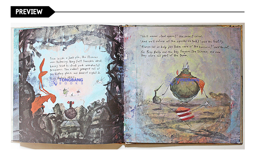 Once upon a time, in a gray endless place called Cementland, a boy finds a treasure box. It¡¯s filled with tiny specks and a wrinkled note that says, ¡°Put these wondrous riches in the earth and enjoy.¡± But a special treasure requires a special guardian, so the boy conjures a creature to protect the specks: Frog Belly Rat Bone. With subtle, delicate tones, fantastical figures, and bursts of glowing color, the surreal artwork and hand-lettered text of Timothy Basil Ering¡¯s picture book debut exude all the whimsy of an inspired imagination.