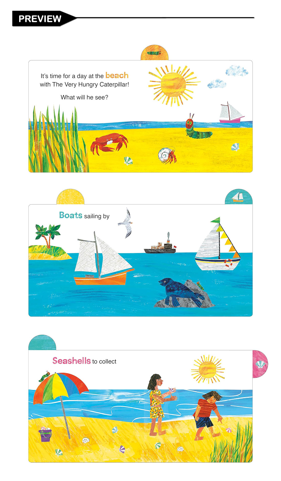 It's time for some fun in the sun! Play with beach toys, collect seashells, and splash in the water in this tabbed board book with easy-to-flip tabs, easy-to-read text, and easy-to-love Eric Carle art featuring The Very Hungry Caterpillar.