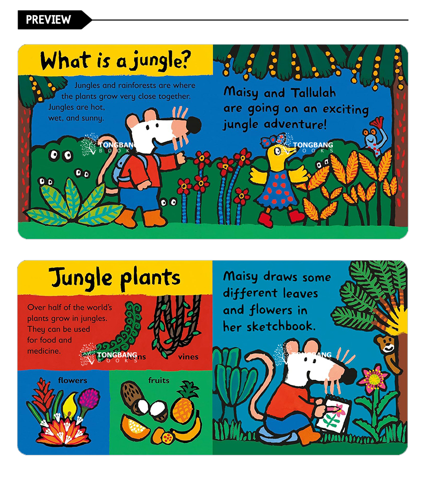 Maisy is off on an astonishing jungle adventure. Experience the sights and sounds of the tropical forest alongside her. Discover its plants, animals, birds, and insects. Shelter from its scorching heat and heavy rain, then open out the final gatefold for a lush jungle scene!