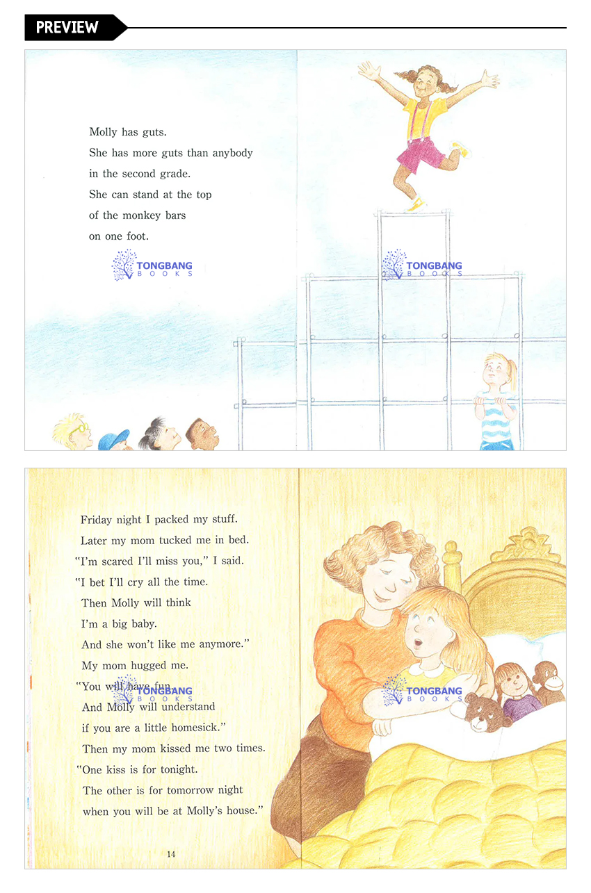 Illus. in full color. Beth wishes she were more like Molly, who doesn't mind if boys hide dead bugs in her desk, and who tells big kids to get lost if they tease her. "Beth is flattered when Molly invites her to stay overnight at her house in the country; when the girls get lost, Beth is the one who gets them home. This read-alone book will be a welcome addition to libraries."--School Library Journal.