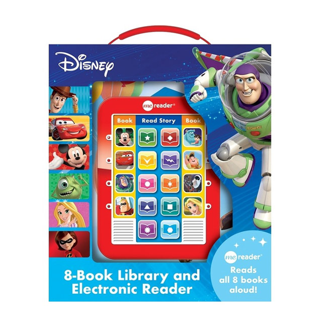 Disney Electronic Reader and 8 Book Library is a new electronic reading system from the makers of Story Reader 2.0. The Me Reader is a 4¨öx6-inch electronic pad that reads out loud each of eight Disney storybooks. The reading pad is compatible only with the storybooks included in the set. The Me Reader system is recommended for children ages 3 years and older. The device is simple to work. To begin, children select one of the eight storybook buttons on the Me Reader, which is made of sturdy hard plastic. Next, they find the storybook they have selected, open to the first page of the story, and press a ¡°Read Story¡± button on the pad to activate the narrator¡¯s voice. Each time they turn a page, children again press a ¡°Read Story¡± button to continue hearing the story. Kids know which ¡°Read Story¡± button to press by matching those on the pad with those in the storybook. The set includes these eight 20-page hardcover Disney storybooks: ? Cars ? Toy Story 3 ? The Incredibles ? Monsters, Inc. ? Up ? Wall-E ? Tangled ? Mickey Mouse Clubhouse The Story Reader Me Reader and Disney 8-Book Library is packaged in a sturdy cardboard storage box with a plastic carrying handle. The Me Reader conforms to the toy safety requirements of ASTM F963-08. Three AAA batteries that power the reading pad are included.