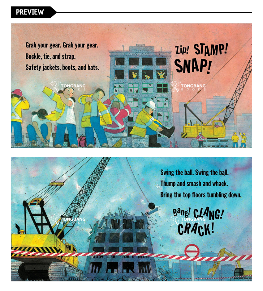 Crush the stone. Crush the stone. Chip and grind and munch. Make new concrete from the old. Whirr! Churr! Crunch! From the huge crane with a swinging ball (crack!) to the toothy jaws that ram the walls (thwock!), this rambunctious demolition, reverberating with sound words, is guaranteed to have small kids rapt. Bright spreads showcase the gargantuan machines in all their glory, and a pictorial glossary explains what each one can do.