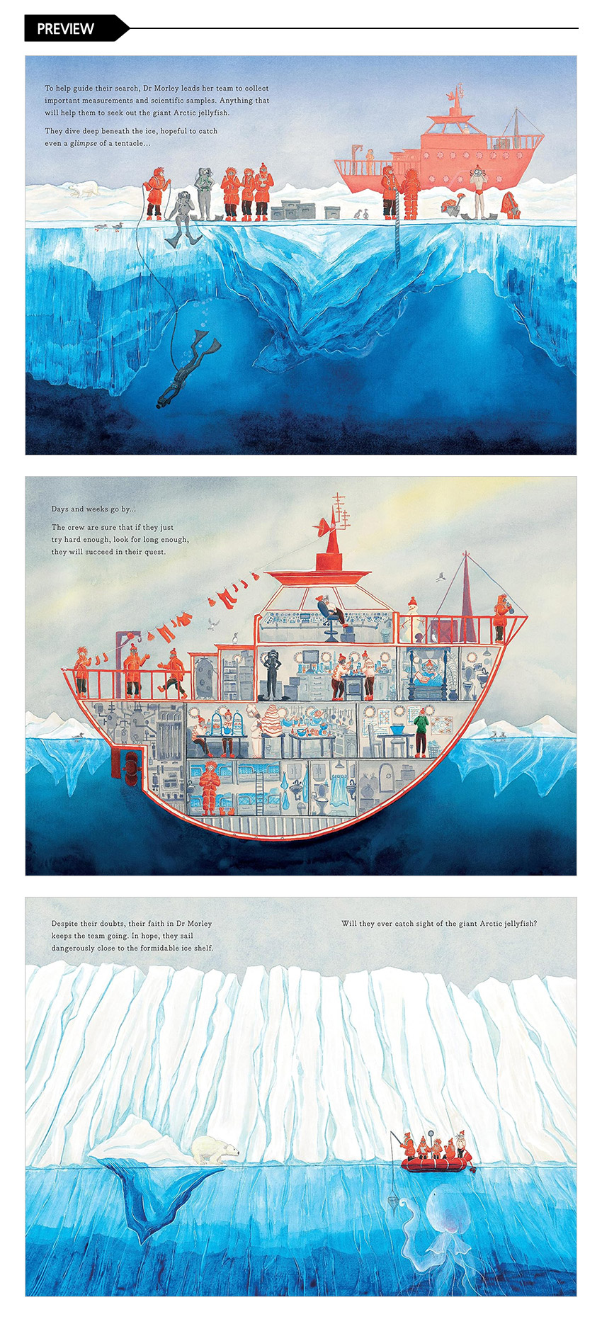 ¡¶The Search for the Giant Arctic Jellyfish¡·¸¦ º¸´Â Àç¹Ì °¡¿îµ¥ Çϳª´Â Àå¸é °÷°÷¿¡ ´ã°Ü ÀÖ´Â À̾߱âµéÀÌ´Ù. ÀÛ°¡´Â ±ÛÀÌ µé·ÁÁÖÁö ¾Ê´Â À̾߱⸦ ±×¸²¸¸À¸·Î ¼¼¹ÐÇÏ°Ô Ç¥ÇöÇØ µ¶Àڵ鿡°Ô À̾߱⸦ °Ç³Ù´Ù. Á©¸®Çǽà »ý°¢¸¸À¸·Î °¡µæÇÑ ¸ô¸® ¹Ú»çÀÇ ¿¬±¸½Ç, ¹è¿¡¼ »ýȰÇÏ´Â ´ë¿øµéÀÇ ´Ù¾çÇÑ ¸ð½Àµé, µ¿·á¿¡°Ô »ç¶ûÀ» °í¹éÇÏ´Â ´ë¿ø±îÁö! ±ÛÀÌ ¾Æ´Ñ ±×¸²¸¸ÀÌ µé·ÁÁÖ´Â À̾߱⿡ ÁýÁßÇϸç ÀÛǰÀ» ´õ Àç¹ÌÀÖ°Ô ¸¸³ª º¸ÀÚ.