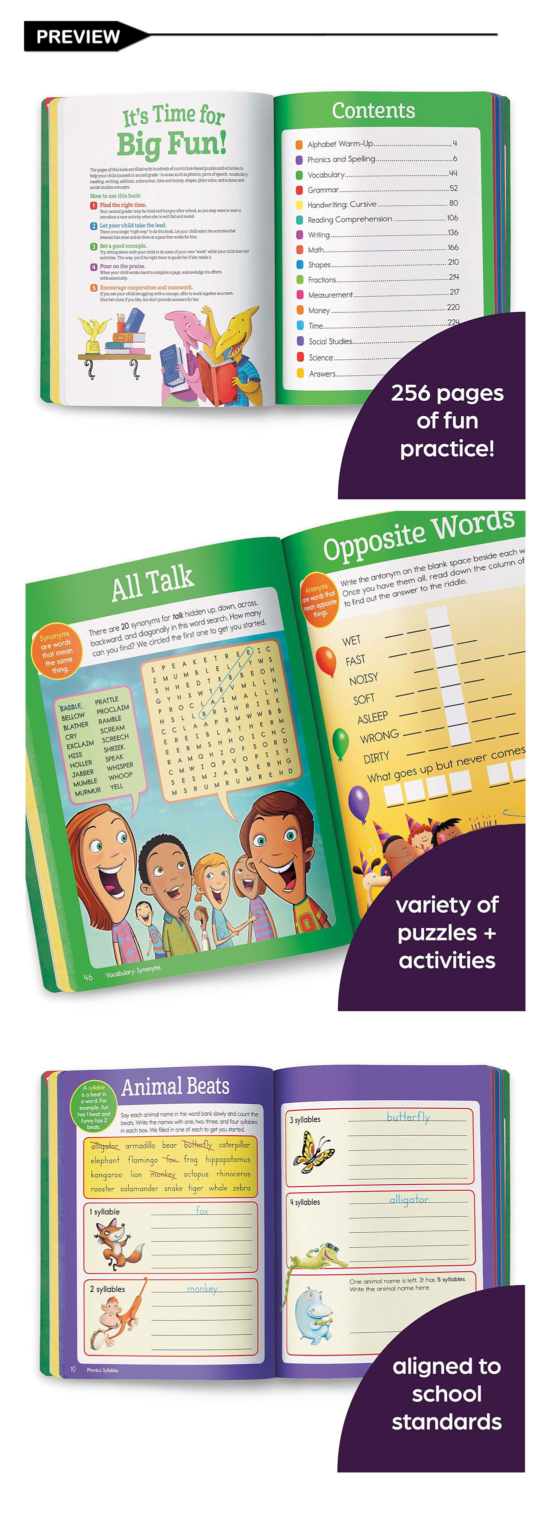 This second grade activity book offers age-appropriate fundamentals in language arts, math and science, plus reading, phonics, vocabulary, grammar, cursive, addition and subtraction, fractions, time, social studies, map skills, science and more!