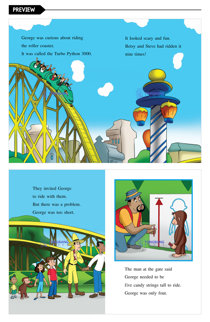 Curious George can¡¯t wait to ride the Turbo Python 3000 with his friends Betsy and Steve at the amusement park. But he is not tall enough! Will George figure out how to ride the roller coaster before the end of the day?