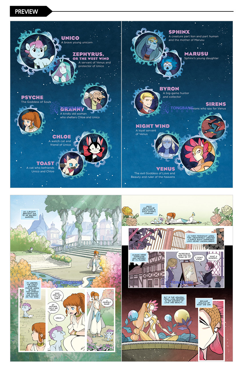 In this first manga, Unico awakes in a mysterious land and is befriended by a resourceful watch cat, Chloe, who feels protective of the young unicorn. When they find themselves near a small village in the forest, they take refuge with a kindly, but helpless, old woman. To take care of her, Chloe begs Unico to turn her into a human girl, but that act of kindness has unforeseen consequences: Unico's love has awakened Venus and her minion, Byron, who want to destroy them both!