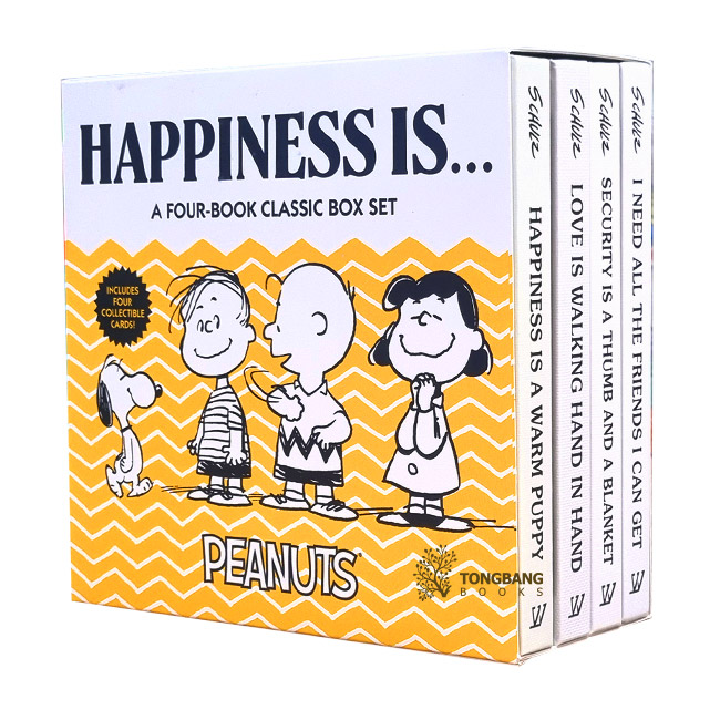 I Need All the Friends I Can Get, Happiness Is a Warm Puppy, Security Is a Thumb and a Blanket, and Love Is Walking Hand in Hand. The box set also comes with four collectible cards with a Peanuts quote!