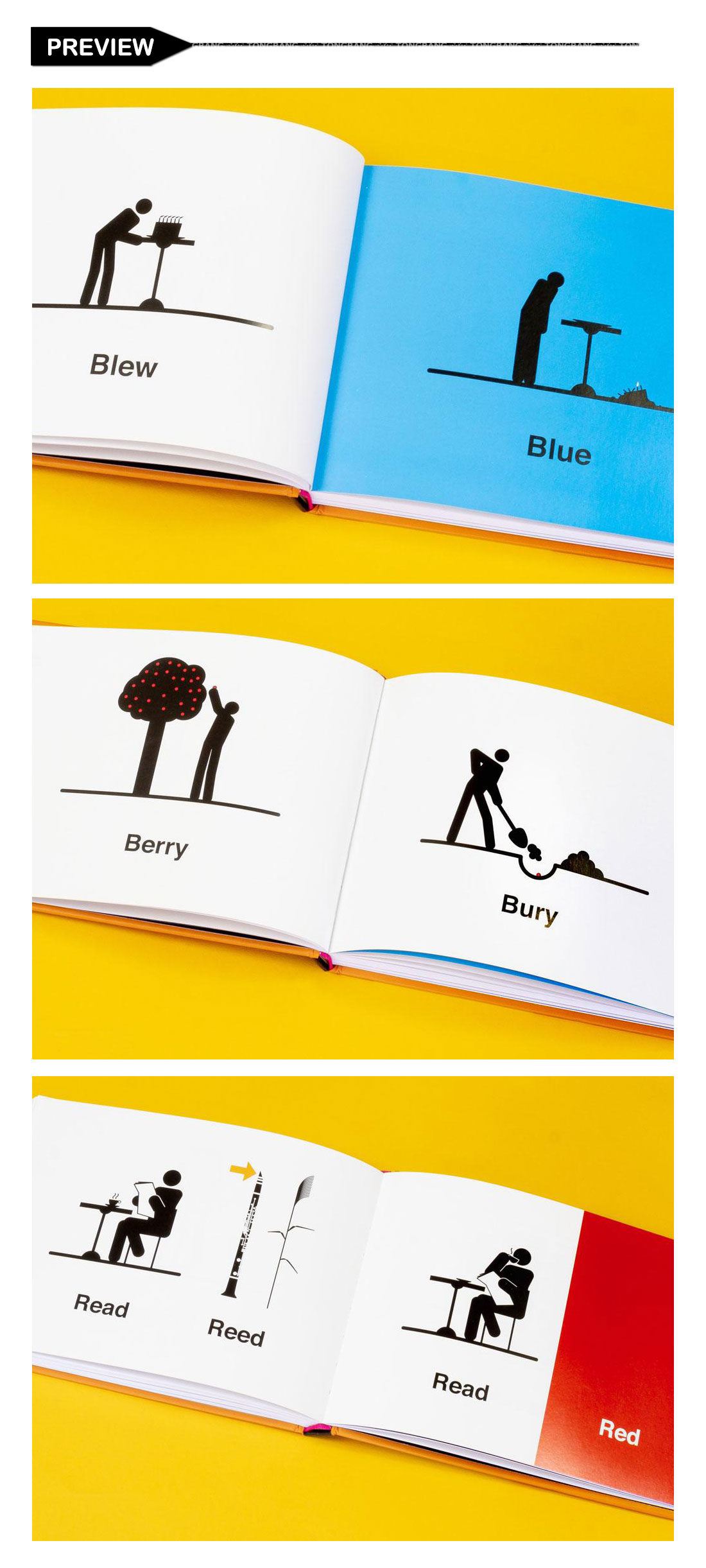 This book uses clever and minimalist graphics to help illustrate the differences between 100 pairs (or triplets or quadruplets) of words that sound alike.