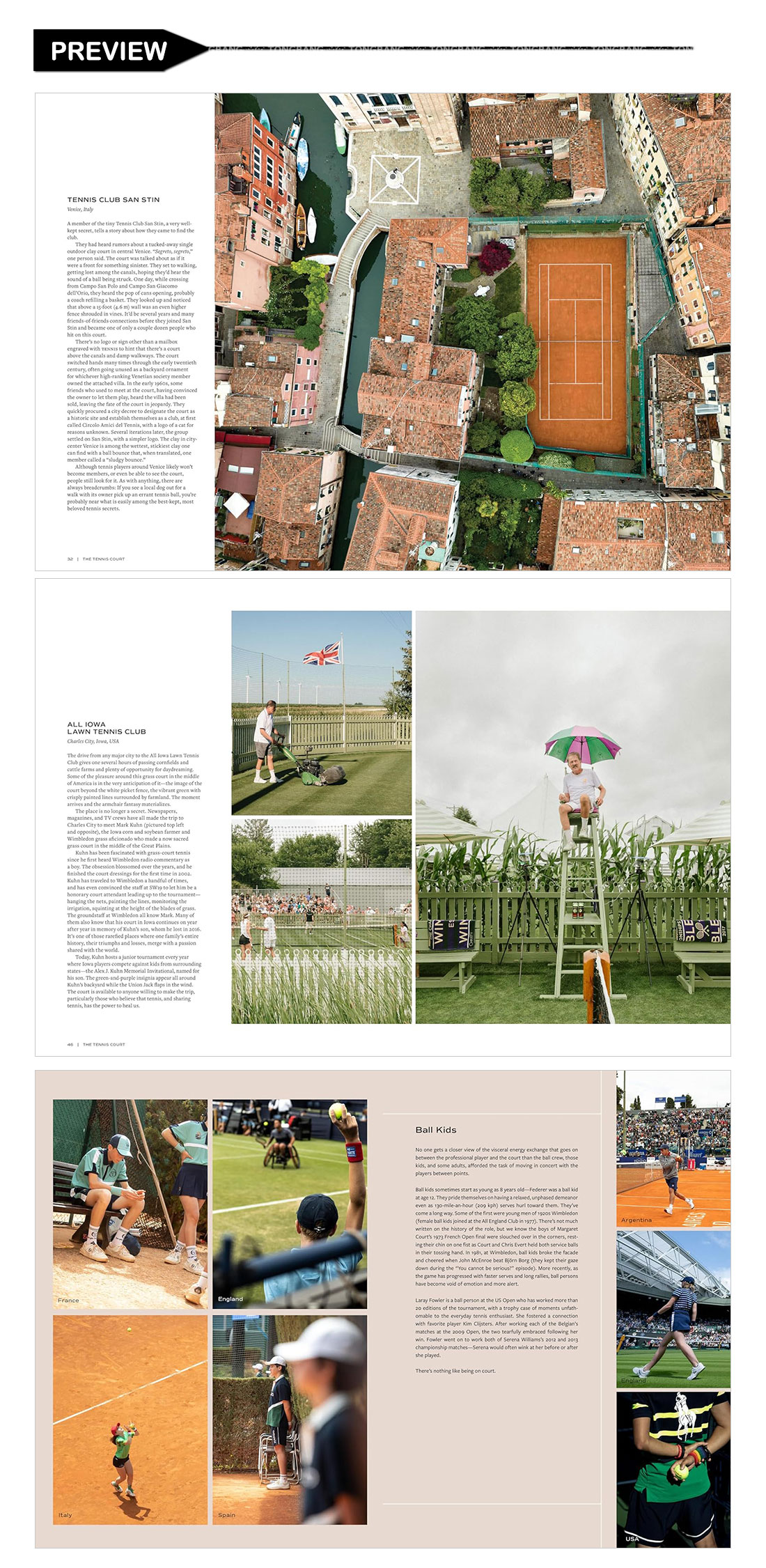 Every one of the world¡¯s half a million tennis courts is, at its most basic, an identical blank canvas: a 78-foot by 36-foot rectangle, divided by a 3-foot-high net in its center, and marked with eleven straight lines. But add in the elements of surface, space, wind, acoustics, crowds, shadows, humidity, and even air density, and every tennis court is unique—a work of art. And some are masterpieces.