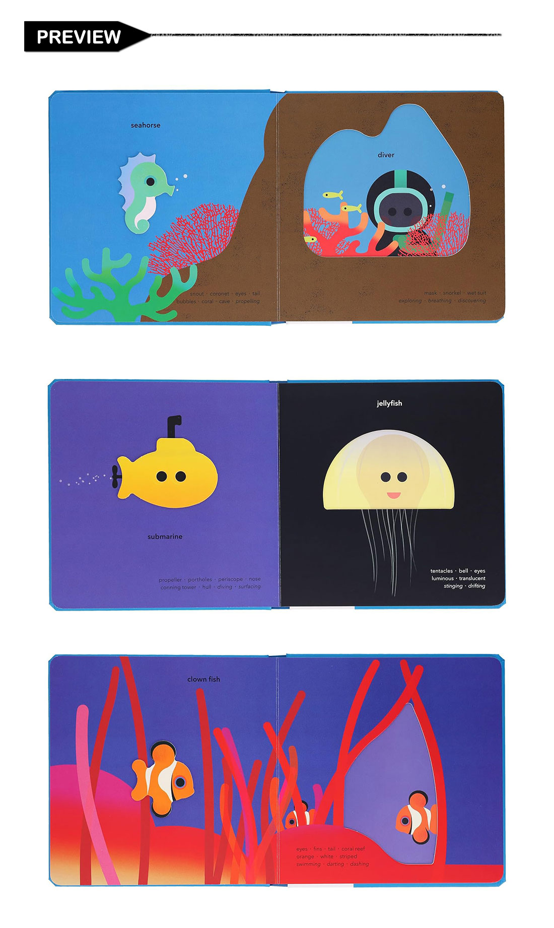 TouchThinkLearn: Underwater is a chunky board book that fully involves little ones by engaging them in exploring marine life in several ways: seeing the image, tracing its shape, saying its name. These modes of perception combine to stimulate understanding of essential concepts. Related words on each spread offer parents and children a springboard for further conversation to encourage the language skills crucial to later successful learning.