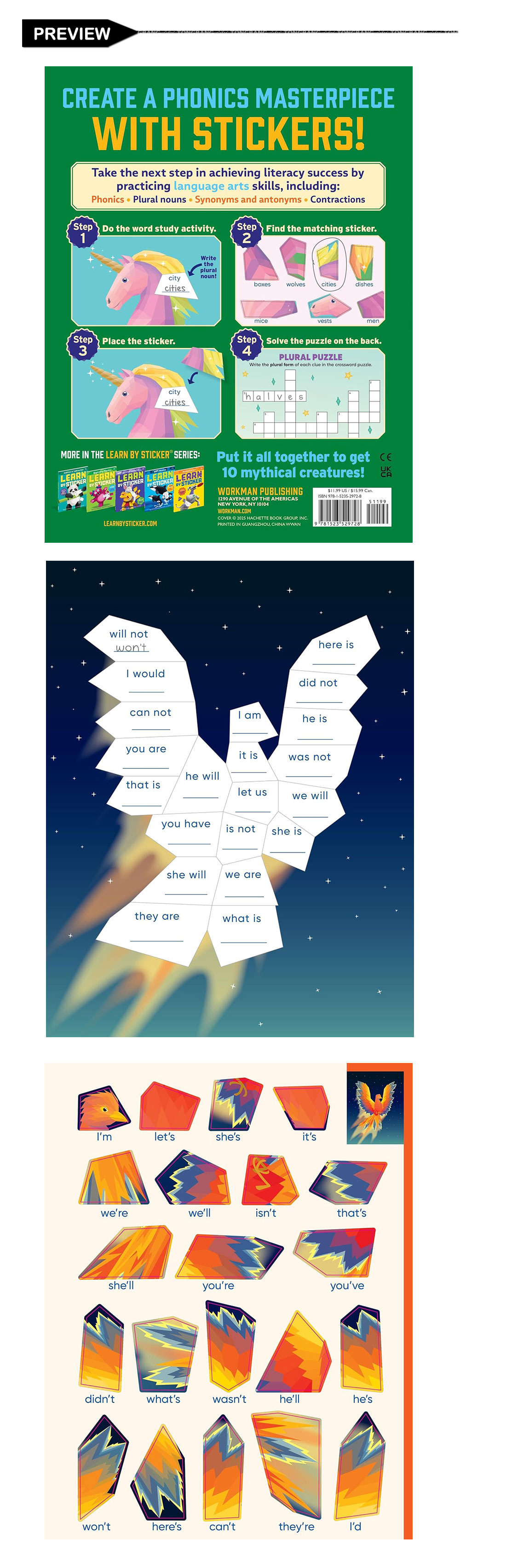 In Learn by Sticker: Word Study, apply third grade-level language arts concepts (including phonics, prefixes and suffixes, synonyms and antonyms, plural nouns, and more) to complete, write, or find words. Then use the answers to determine where to place each sticker to create images of ten beautiful mythical creatures. Plus, the back of each sticker page contains fun, critical thinking-based word study activities like riddles, crossword puzzles, and more.