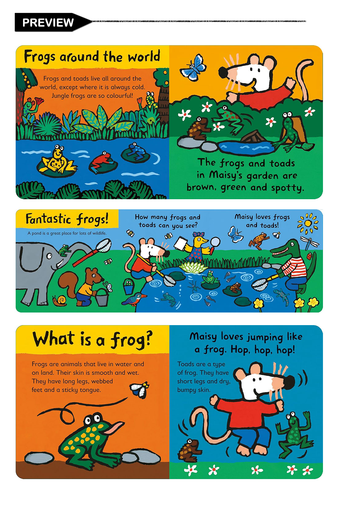Frogs are fantastic! Every toddler who has been up close and personal with one of these big-eyed amphibians—as well as those not so sure about the bumpy green guys—will be intrigued by this fun introduction to frogs and toads with Maisy leading the way. Young children can find out about everything from tadpoles to lily-pad-leapfrogging in a gentle learning experience, then open out the final inviting scene as Maisy and friends make a frog-friendly pond in her backyard.