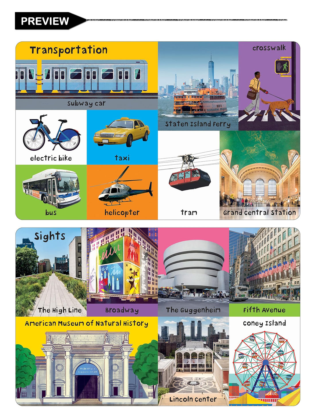 In addition to landmarks and sights, it also includes images of animals, food, sports, nature, and more. Each picture has a simple word label to develop your child's picture recognition skills and vocabulary.