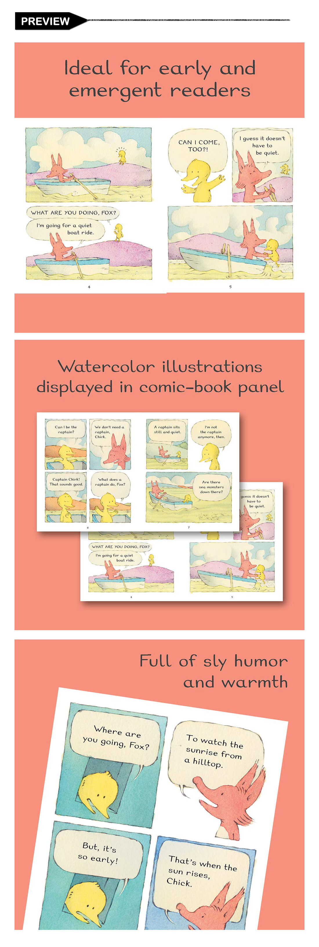 In the tradition of Frog and Toad, this critically acclaimed early reader series features Fox and Chick – two unlikely friends who despite their differences always manage to find a way to get along. In this second book in the series, Fox and Chick go on three adventures involving a boat ride, a mysterious box, and an early morning trip to see the sunrise. The universal characters, humor and comic-style layouts make it ideal for both the picture book audience and emerging readers.